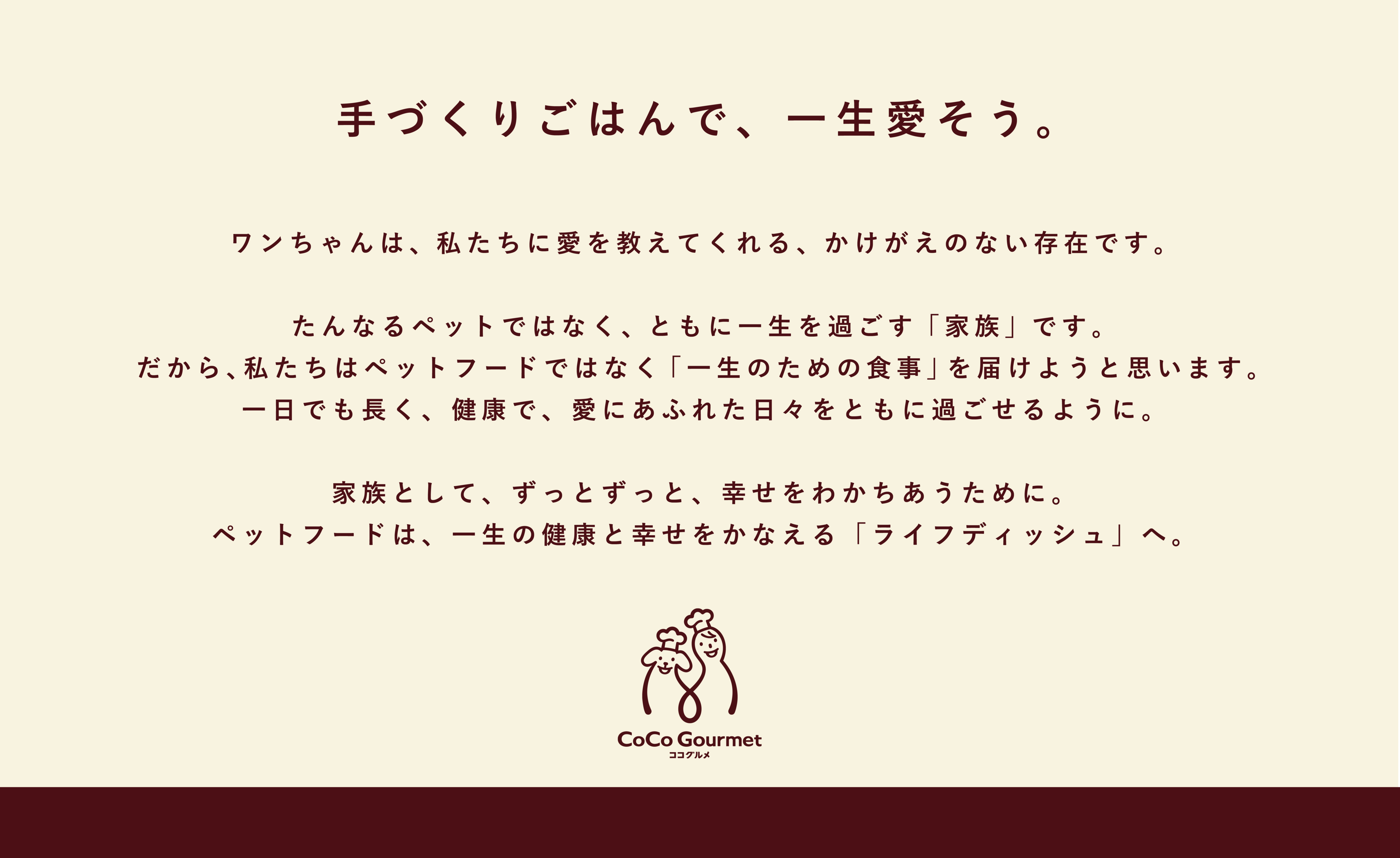 私たちココグルメ・ミャオグルメは、全国のわんちゃんねこちゃんたちの食事をもっと美味しく・楽しく・豊かにするために、家庭で作る私たちの食事と同等の食材選び・調理法・衛生管理を徹底したフレッシュペットフードに関する情報発信を行っております。